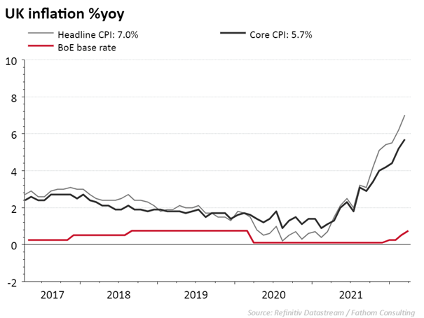 Inflatie, er lijkt geen ontsnappen aan, ook niet in het Verenigd Koninkrijk. De Britse consumentenprijzen groeiden vorige maand met 7 procent, het hoogste niveau in dertig jaar tijd. Dat is voor een groot stuk het gevolg van de schokken op de energiemarkten sinds het uitbreken van de oorlog in Oekraïne. Met ongeveer 4 procent van de aardgasinvoer uit Rusland is het VK minder afhankelijk van Russisch aardgas in vergelijking met de rest van Europa. Voor olie en diesel ligt dat anders. Ongeveer 8 procent van de Britse invoer van ruwe olie en 13 procent van de dieselimport is afkomstig uit Rusland. De Britse regering heeft beloofd om de Russische olie tegen eind dit jaar uit te faseren maar dat heeft geen effect op de dure prijzen.