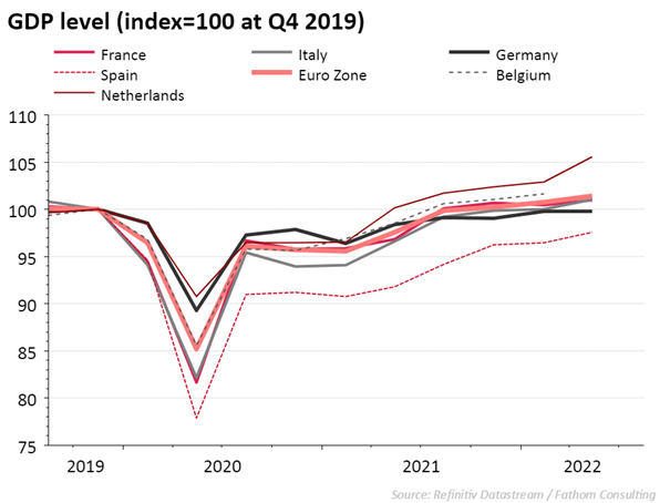 Eerst het goede nieuws. Tijdens de lente groeide het bbp van de eurozone met 0,6 procent t.o.v. het kwartaal ervoor. Medio 2022 is de Europese economie al 1,4 procent groter dan eind 2019, vóór de start van de Covid-19-pandemie. Daar houdt het goede nieuws echter op. Want het economisch herstel in Europa blijft ongelijk verdeeld en lijkt geen lang leven beschoren.