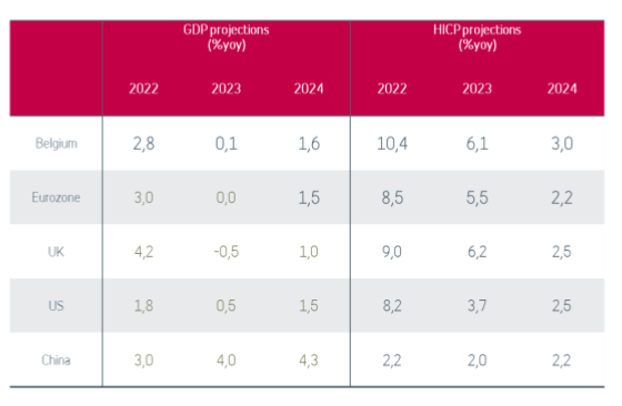 Ondanks sombere voorspellingen lijken de energietekorten in Europa deze winter te zijn afgewend, grotendeels als gevolg van ongewoon zacht weer en inspanningen om het verbruik te matigen. Maar de crisis is nog niet voorbij. De kans is groot dat er volgend jaar helemaal geen gas meer stroomt vanuit Rusland naar Europa. Het risico op energietekorten blijft dus hoog, zeker als de Chinese vraag naar het vervangende LNG in 2023 zou toenemen. Heel wat bedrijven in de verwerkende nijverheid hebben de voorbije maanden hun productie al teruggeschroefd of stopgezet omdat de energiekosten te hoog zijn. De fabrieksactiviteit in de eurozone is gedaald tot het laagste niveau sinds de eerste Covid-golf en door de onzekere vooruitzichten worden investeringsplannen uitgesteld of opgeborgen. Ook de uitgaven door de consumenten staan onder zware druk want door de torenhoge inflatie daalt het beschikbaar inkomen van de gezinnen in reële termen. Dit trimester valt er niet te ontsnappen aan een daling van het bbp en ook bij het begin van 2023 houden we rekening met een beperkte economische krimp. De rest van het jaar blijven de groeivooruitzichten zeer bescheiden, wat een gemiddelde nulgroei oplevert voor 2023.