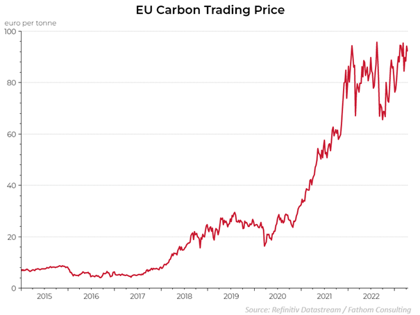 Met ETS II zet Europa vanaf 2027 ook een kostprijs op de vervuiling die het wegverkeer en onze gebouwen produceren. In feite zal het systeem in zijn huidige vorm dicht bij een koolstofbelasting liggen met een maximum prijsniveau van 45 EUR/ton, in ieder geval tot 2030. Vanaf dan is er geen prijsplafond voorzien. Experts zijn het erover eens dat een prijs van 45 EUR/ton vrij zwak is als prikkel om het gedrag van de Europese consumenten te veranderen. Zo kosten de emissierechten in het originele ETS-systeem vandaag meer dan 90 euro per ton (zie grafiek).