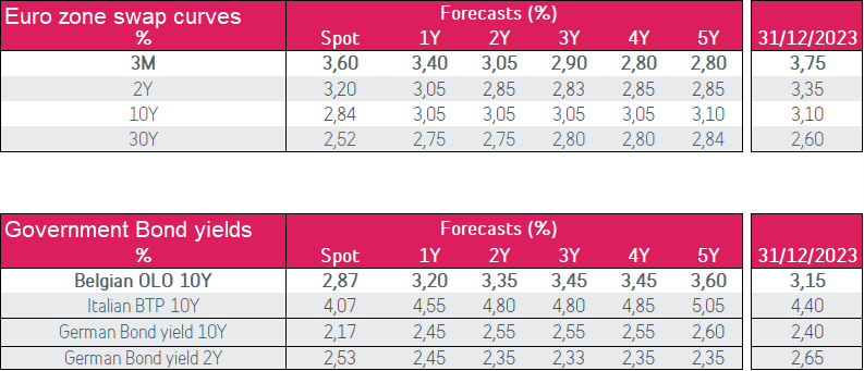 In de Eurozone ziet het plaatje er helemaal anders uit. De renteverhoging met 25 basispunten is een vertraging in het tempo van de renteverhogingen (zie grafiek). De drie vorige vergaderingen was de rentetoename immers dubbel zo groot. Maar voorzitster Lagarde maakte in de persconferentie heel duidelijk dat de ECB nog niet aan een pauze toe is. De komende maanden zal de rente nog verder verhoogd worden. De huidige rentetarieven zijn nog niet "voldoende restrictief" om de inflatie terug te brengen naar de doelstelling van 2%. Belfius Research verwacht nog twee renteverhogingen van 25 basispunten dit jaar, wat de depositorente tegen eind dit jaar op 3,75% zal brengen. Volgens onze prognoses (zie tabel) bedraagt de tienjaarsrente op Belgische overheidsobligaties tegen eind dit jaar 3,15%. De ECB zal ook de afbouw van haar obligatieportefeuille versnellen. Obligaties in het kader van het APP (Asset Purchase Programme) die op vervaldag komen zullen niet langer herbelegd worden vanaf juli.