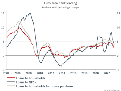 Eén ding is zeker: ondanks een gecumuleerde cyclus van 5% aan verhogingen voor de Fed en 4% voor de ECB, is de inflatie nog altijd niet onder controle. Hebben de centrale banken met andere woorden gefaald? Ondanks de ontgoochelende inflatie leiden we uit de meest recente indicatoren van de financiële voorwaarden af dat het monetair beleid wel degelijk doorwerkt in de economie. De hogere rentevoeten hebben een effectieve impact op wat gezinnen en bedrijven doen. Hun kredietvoorwaarden verstrengen en het aantal kredietaanvragen valt terug (zie bovenstaande grafiek), terwijl ze hun deposito’s in cash overhevelen naar minder liquide activa, die met andere woorden minder gemakkelijk kunnen worden omgezet in consumptiebestedingen.