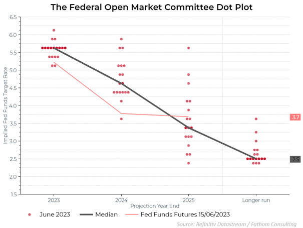 De Amerikaanse centrale bank liet haar rentevoeten ongewijzigd, maar zette de deur open voor twee verdere verhogingen in de loop van dit jaar. Een bijzonder moeilijke evenwichtsoefening voor voorzitter J. Powell, die voor een zaal vol journalisten uitleg moest geven bij twee beslissingen die a priori tegenstrijdig zijn: die van een pauze die wordt ingelast na een reeks van 10 opeenvolgende verhogingen, en tegelijkertijd de bekendmaking van twee extra verhogingen die tegen december mogelijk noodzakelijk zullen zijn. Deze bijeenkomst ging immers gepaard met de nieuwe publicatie van de fameuze "Dot Plots" van de instelling (zie grafiek) - wat wil zeggen de "weg" die de beleidsrente volgens elk lid met stemrecht van de Fed zal volgen, telkens vertegenwoordigd door een punt ("Dot"). Deze projecties werden een half procent opwaarts herzien, parallel met een herziening, eveneens in opwaartse zin, van de groeivooruitzichten en van de inflatieprognose. Voor de structurele inflatie, het geliefkoosde streefdoel van de Federal Reserve, gaat men nu uit van 3,5 tot 3,9% in 2023, een stuk hoger dan het streefcijfer van de centrale bank.