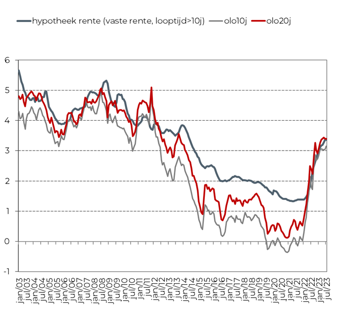 Houdt de woonmarkt stand in een omgeving van hoge inflatie en oplopende rentetarieven? Op korte tijd zijn de omstandigheden voor residentieel vastgoed sterk veranderd. De vraag naar woningen steeg spectaculair tijdens de Covid-19 jaren, omdat de Belg groter wilde wonen of op zoek was naar buitenruimte. Bovendien zakte de hypothecaire rente in die periode naar een historisch dieptepunt. Daar kwam abrupt verandering in toen Rusland in het voorjaar van 2022 Oekraïne binnenviel. De oorlog op Europese bodem maakte grondstoffen en energie fors duurder en de inflatie schoot omhoog. Op de obligatiemarkten stegen de lange termijnrentes onder druk van de hoge inflatiecijfers en de ECB was genoodzaakt om haar beleidsrente drastisch te verhogen. Hierdoor zijn de hypotheekrentes in België (zie grafiek 1) op één jaar tijd meer dan verdubbeld.