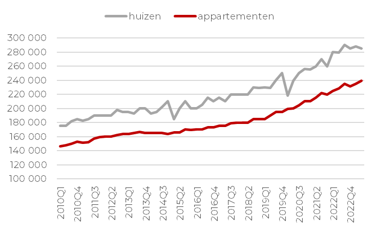 De gemiddelde verkoopprijs voor een woonhuis bedroeg 285,000 euro en voor een appartement werd gemiddeld 239,000 euro betaald (zie grafiek 3).