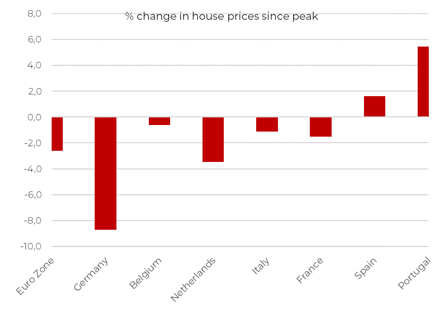 De residentiële vastgoedprijsindex stelt ons in staat om de vastgoedinflatie in ons land te vergelijken met die in de rest van Europa. Die laat zien dat in de buurlanden, de nominale vastgoedprijzen al enkele kwartalen onder neerwaartse druk staan. De daling van de prijzen sinds de piek van 2022 is bij ons minder uitgesproken dan in Duitsland, Nederland en Frankrijk.