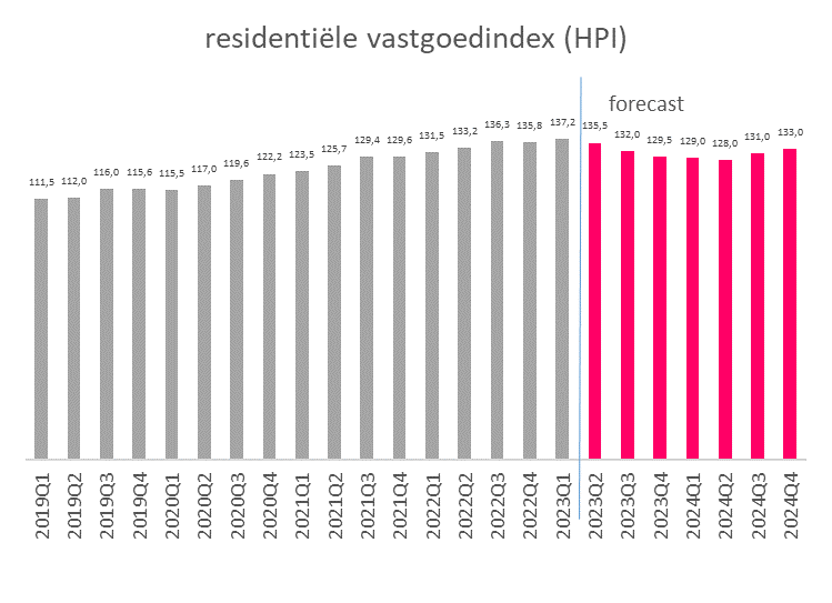 We verwachten dat de huizenprijzen dit jaar gemiddeld 0,5% lager zijn dan in 2022. In de loop van volgend jaar zien we de prijzen stabiliseren. Door het overloopeffect van de voorziene prijsdaling in de tweede helft van dit jaar, liggen de huizenprijzen in 2024 naar verwachting gemiddeld 1,5% lager dan in 2023.