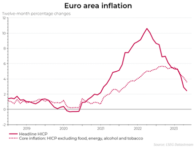 Geconfronteerd met de indrukwekkende daling van de inflatie tijdens de afgelopen maanden, hebben de markten hun voorspellingen aanzienlijk herzien. Ze menen dat de centrale banken aan beide zijden van de Atlantische Oceaan hun beleidsrente zullen laten dalen met 1,5%, en dit zelfs al vanaf de lente. Dit lijkt ons te snel. Zo onderstreepte de voorzitter van de ECB Christine Lagarde dat renteverlagingen nog niet besproken zijn in de raad van bestuur. Ze wacht op harde data in de komende maanden. Hoe evolueren de lonen? Hoe communiceren de bedrijven binnenkort over hun winstverwachtingen? Want als bedrijven hun marges verhogen, kan dat ook prijsverhogend werken.
