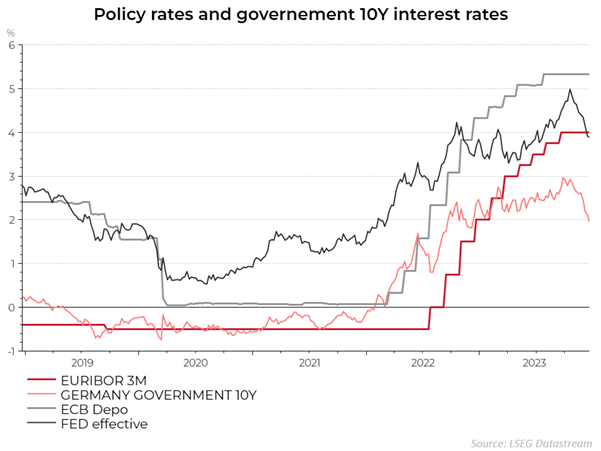 Maar aan het einde van 2023 zien we de inflatie sneller afbrokkelen dan eerst gedacht. Bovendien zijn er duidelijk tekenen dat de wereldeconomie vertraagt. En dus denken de markten dat de centrale banken hun beleidsrente binnenkort weer zullen verlagen. Want als ze te lang op de rem staan zouden ze de economie in een recessie kunnen duwen. Mogen we dus een cyclische daling van de rentes verwachten tijdens het komende jaar?