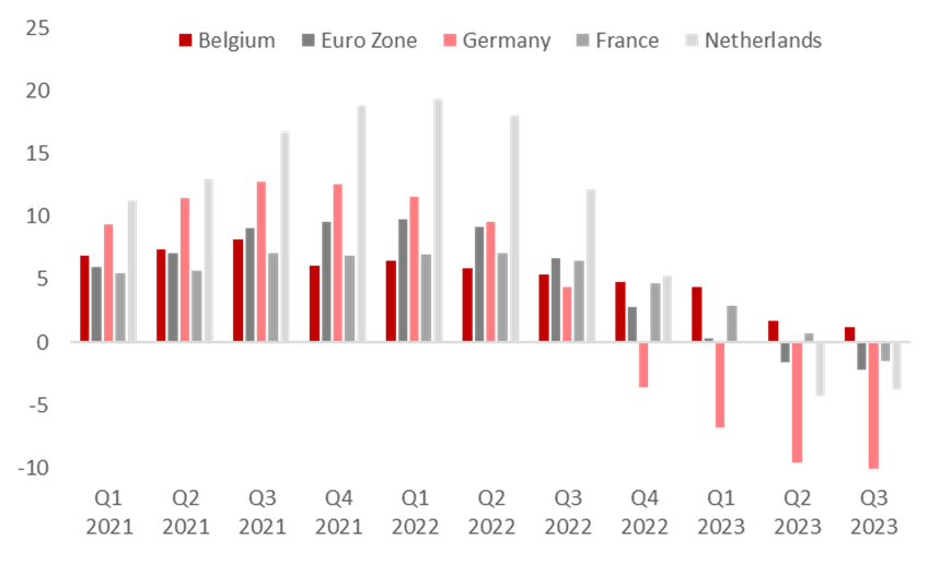 In vergelijking met de buurlanden hielden de Belgische vastgoedprijzen in 2023 duidelijk beter stand. In de eurozone daalden de huizenprijzen gemiddeld met 2,2 procent in het derde trimester. Vooral Duitsland en Nederland kregen te maken met een aanzienlijke val van de prijzen sinds de piek van 2022.