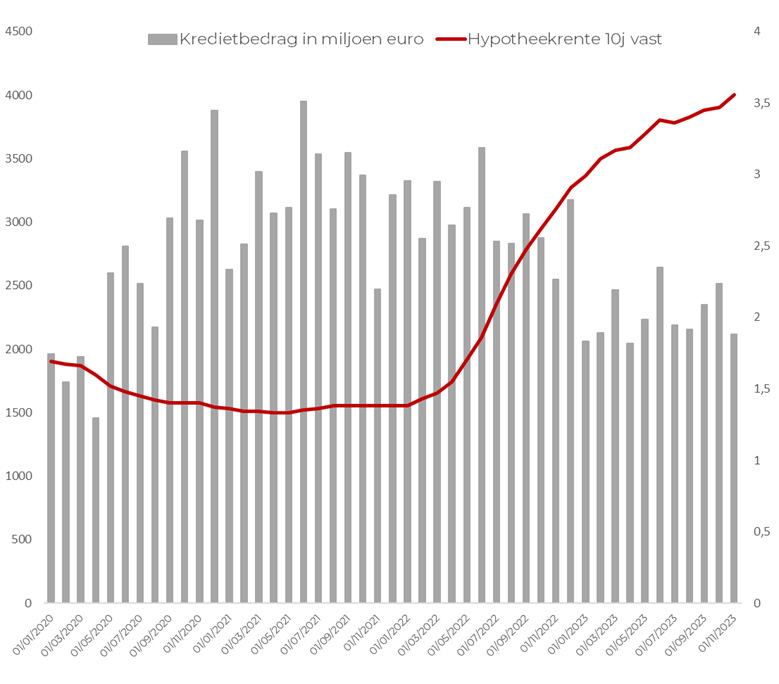 Tot begin 2022 was de rente één van de drijvende krachten voor een sterke vraag op de vastgoedmarkt, wat de activiteit en de prijzen fors hoger duwden. Door de lage stand van de rente kon er door kopers en bouwers goedkoop geld worden geleend. Ook investeerders toonden een grote interesse voor woonvastgoed als alternatief voor de relatief lage rentevergoeding op klassieke beleggingen. Sindsdien zijn de langetermijnrentes op de financiële markten en de hypotheekrentes in snel tempo gestegen. Samen met de economische onzekerheid zorgde dat voor minder appetijt om een woning te kopen.