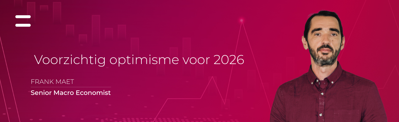 De inflatie in 2025 normaliseerde verder en zal uitkomen op een gemiddelde van ongeveer 3%. In 2026 zal inflatie sterk terugvallen, tot een 1,5% gemiddeld op jaarbasis. Dit wordt grotendeels gedreven door dalende energieprijzen. Deze zullen vanaf januari significant lager uitkomen dan begin 2025, met een sterk neerwaartse druk op de energie-component van inflatie als gevolg. We veronderstellen ook dat kerninflatie, en meer specifiek inflatie in de dienstensector, verder zal normaliseren, gegeven het feit dat deze onderhevig is aan wijzigingen in de lonen, dewelke door de loonnormwet, en bijkomend door inperking van de index in 2026 zal matigen.
