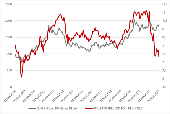De goudprijs wordt beïnvloed door de inflatie, maar ook door de rente. Doordat goud niets uitkeert, leidt een rentestijging tot een opportuniteitskost. De inflatie en de rentevoeten oefenen dus een tegengestelde druk uit op de goudprijs. Een inflatiestijging duwt de goudprijs omhoog, een rentestijging doet hem zakken. Wat telt, is de reële rente, d.w.z. de (nominale) rente min de door de markt geraamde inflatie. Hoe lager de reële rente is, hoe beter goud het doet. Onderstaande grafiek illustreert dat verband doordat hij de prijs van een ons goud en de rente van de Amerikaanse TIPS (Treasury Inflation Protected Securities), die representatief is voor de reële rente, weergeeft.