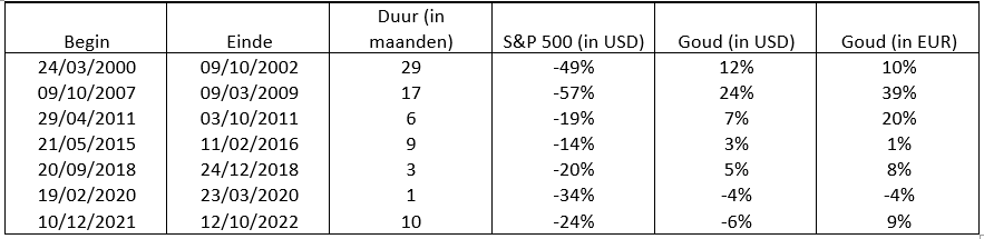 Dit vermogen van goud om tijdens fasen van marktcorrectie goed te presteren, blijkt uit onderstaande tabel. Daarin staan de perioden van sterke daling van de S&P 500, de beursindex van de 500 grootste Amerikaanse beurskapitalisaties, de procentuele daling van deze index en de evolutie van de goudprijs. Die "verzekering" was uiterst nuttig tijdens de crisis van de internetzeepbel in 2001 en de grote financiële crisis van 2008. De enige periode waarin ze de Europese belegger niet ten goede kwam, is die waarin zich een bliksemcorrectie heeft voorgedaan, die slechts een maand heeft geduurd, namelijk in het begin van de covid-19-crisis.