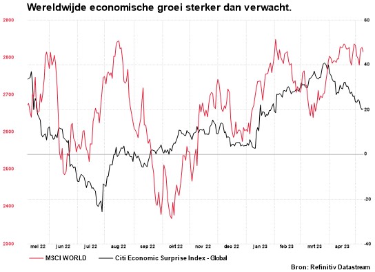 Begin dit jaar heerste er veel pessimisme. De zwarte lijn op onderstaande grafiek geeft de Citi Economic Surprise Index weer. Een positieve waarde geeft aan dat de economische data beter zijn dan verwacht door analisten. Sinds begin dit jaar zien we dat de economische data consistent beter waren dan verwacht. Hierdoor werden recessie angsten naar later in het jaar verschoven en deed de aandelenmarkt (rode lijn) het goed.