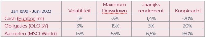 We hebben dit verband geanalyseerd door een vergelijking te maken tussen de volatiliteit en de maximum drawdown van aandelen, obligaties en een korte termijnbelegging in EUR. Daarvoor namen we respectievelijk de MSCI World (wereldwijde aandelenindex), de Belgische staatsobligatie (OLO) op 5 jaar en de Euribor op 1 maand over een periode van 1999 tot mei 2023.