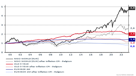 We stellen vast dat de MSCI World als enige van de drie activa de koopkracht substantieel heeft doen toenemen. Een euro die in 1999 werd belegd in de MSCI World zou vandaag 2,6 euro waard zijn (koopkracht toegenomen met 160%) na correctie met de inflatie. Voor de OLO op 5 jaar komen we uit op 1,2 euro (+20%) en voor de Euribor 1 maand op 0,8, dat is een verlies aan koopkracht van 20%.