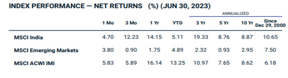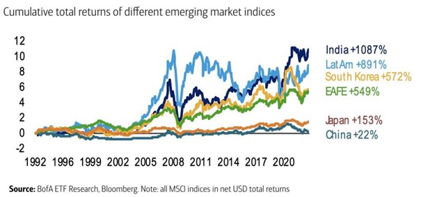 De MSCI Emerging Markets index, vaak afgekort tot MSCI EM, is een index die in 1988 in het leven werd geroepen door de firma MSCI. Hij omvat de beurzen van de ontwikkelingslanden. India vertegenwoordigt ongeveer 14% van de MSCI Emerging Markets index. Volgens een recente studie van Bloomberg heeft de Indiase markt het wereldrecord in handen van het aantal aandelen waarvan de waarde het voorbije decennium is toegenomen met een factor 10 (de "10x baggers"- worden omschreven als waarden waarvan de koers tijdens de voorbije tien jaar vermenigvuldigd werd met een factor tien). In onderstaande grafiek ziet u de uitstekende prestatie van de MSCI India tijdens de voorbije 30 jaar in Amerikaanse dollar.