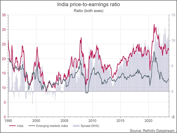 Wie wil beleggen in deze veelbelovende markt, krijgt evenwel te maken met een groot probleem: de waarderingen van de aandelen hebben hun piekniveau bereikt. De Indiase markt is duur, dat klopt, maar dat is altijd al zo geweest! Historisch gezien geeft die een premie te zien ten belope van 40-45% in vergelijking met de koers-winstverhoudingen van de groeilanden. Volgens Refinitiv datastream bedraagt de koers-winstverhouding van de Indiase index 23,01 tegen een gemiddelde van de groeilanden van om en bij de 13,167. Het verschil (de spread) ligt dus historisch gesproken heel hoog.