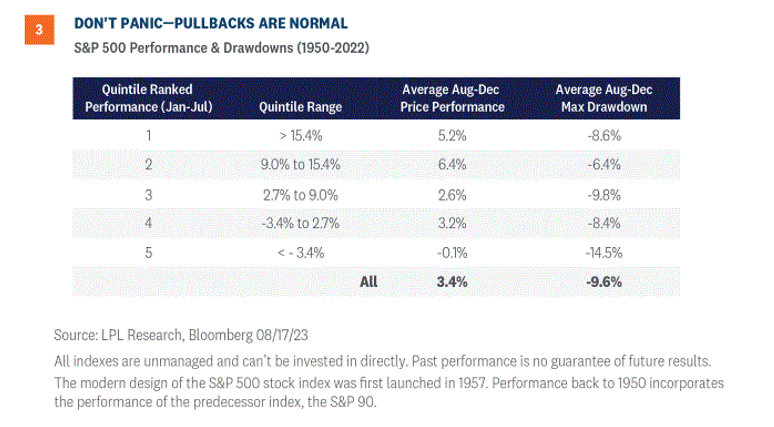 Om de gegevens uit te splitsen, hebben we het rendement van de S&P®500 gerangschikt per kwintiel (elk kwintiel bevat een vijfde van de gegevens uit de totale dataset) van 31 december tot 31 juli, en dat voor elk jaar teruggaand tot 1950. Vervolgens analyseren we de overeenkomstige gemiddelde rendementen en de maximale verliezen voor de rest van het jaar voor elke kwintiel groep. Met een S&P®500 die 19,5% hoger noteerde op 31 juli, bevindt dit jaar zich in de hoogste kwintiel. Deze groep bleef van augustus tot december gemiddelde rendementen vertonen van 5,2%, ondanks een maximale gemiddelde daling van -8,6%.