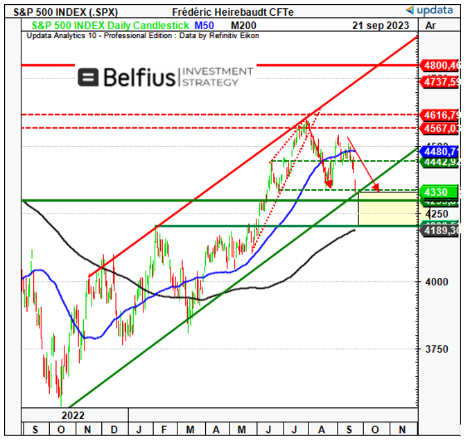 De omvang van de daling zou beperkt kunnen blijven tot de zone tussen 4.200 en 4.300 op de S&P®500, met een mogelijk pessimistisch scenario dat zou kunnen dalen tot het gemiddelde op 200 dagen. De cashmiddelen op de geldmarkt op een recordpeil, de hoger dan verwachte winsten, een terugvallende inflatie en het vermoedelijk einde van de opwaartse rentecyclus van de Fed, zullen wellicht voldoende fundamentele steun bieden om de beleggers ertoe aan te zetten om van de daling te profiteren.