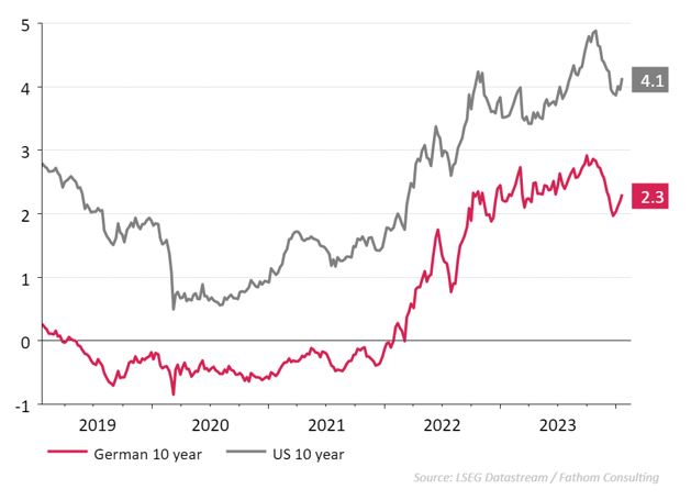 De stijgende trend van de 10-jarige rente stopte eind 2023 toen duidelijk werd dat de centrale banken in 2024 de beleidsrentes zullen verlagen. Terwijl in oktober de 10-jarige rente in de VS de kaap van 5% nog leek te nemen – en in Duitsland 3% – stopte die trend. In december dook de Amerikaanse rente even onder 4%, de Duitse onder 2%.