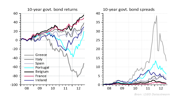 Na de oprichting van de eurozone in 1999 ging de markt uit van een uniform risico voor alle lidstaten. Bijgevolg waren er nauwelijks renteverschillen tussen de verschillende lidstaten. Daar kwam een einde aan toen in 2009 de eurocrisis uitbrak. Griekenland bleek niet in staat zijn schulden terug te betalen, waardoor de prijs van Griekse staatsobligaties kelderde (zie grafiek links hieronder). De markt begreep dat het risico verbonden aan de obligaties van de verschillende lidstaten wel degelijk verschilde. Dit leidde tot hogere rentes voor landen met meer overheidsschulden en dus lagere koersen. De grafiek rechts geeft de risicopremies op overheidsobligaties tussen 2008 en 2012 weer.