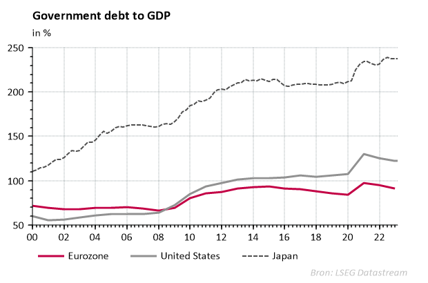 De stijging van de overheidsschuld (in verhouding tot het bruto binnenlands product) beperkt zich niet tot de Europese landen. Zo stijgt de schuldgraad in Japan en de VS bijvoorbeeld meer dan in de Eurozone. De situatie van de landen in de eurozone is echter uniek. Bij de creatie van de monetaire unie hebben alle lidstaten de autonomie over hun monetair beleid opgegeven. De grafiek hieronder geeft de overheidsschuld weer, als een percentage van het bruto binnenlands product.