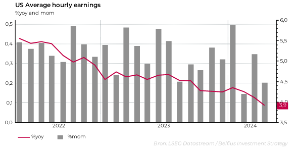Daarnaast zien we dat inflatie, zeker in Europa, evolueert richting het objectief van de centrale banken van 2%. De gemiddelde stijging van de salarissen is al een tijd een doorn in het oog van de Amerikaanse centrale bank, aangezien die de inflatie structureel hoog hield. Voor het eerst sinds 2021 zien we dit cijfer onder de 4% dalen (zie onderstaande grafiek). Dit is een belangrijke indicator dat inflatie, ook in de VS, de juiste richting uitgaat.