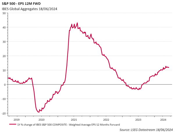 Rentevoeten die gedurende langere tijd hoog zouden blijven, kunnen een teken zijn van betere economische vooruitzichten die gunstig zijn voor de winstgroei van de bedrijven. De vooruitzichten voor de winstgroei van de bedrijven van de S&P 500 voor de eerstvolgende 12 maanden zijn overigens toegenomen in de loop van 2024 (grafiek 3). De winsten zouden de komende 12 maanden met 12% stijgen.