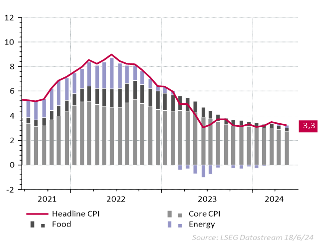 Ondanks de bemoedigende cijfers oordeelt de Fed dat de vooruitgang die werd geboekt met het oog op het halen van de inflatiedoelstelling van 2% te bescheiden blijft. Ze wijzigde in juni de beleidsrente dan ook niet en zei er tegelijkertijd bij dat een renteverlaging zal afhangen van de toekomstige cijfers. Aandachtspunten blijven de werkgelegenheid en de lonen. De banencreatie blijft stevig. Ze overtrof de verwachtingen in mei (+272 000) en de stijging van het gemiddeld uurloon blijft hoog (4,1% op jaarbasis).1