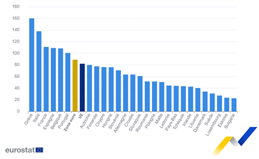 De hoogste verhoudingen tussen de overheidsschuld en het bbp werden opgetekend in Griekenland (159,8%), Italië (137,7%), Frankrijk (110,8%), Spanje (108,9%), België (108,2%) en Portugal (100,4%).