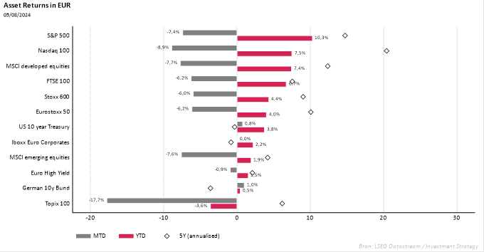 De markten dalen sinds midden juli. Deze daling bereikte een (voorlopig?) hoogtepunt op 5/8. Vooral Japan kent grote verliezen.