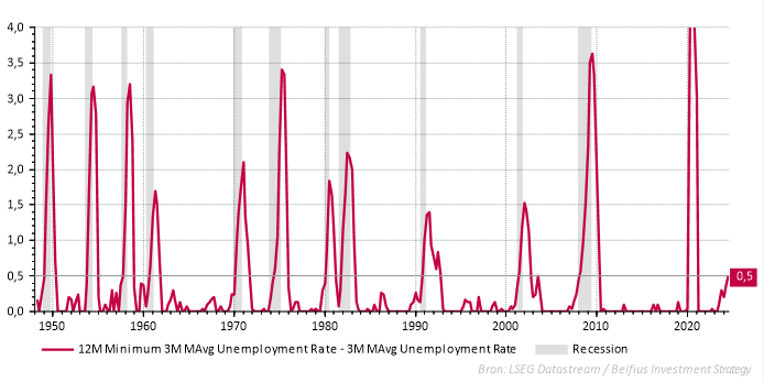 De sterke stijging van de werkloosheidsgraad triggert de Sahm rule: als de werkloosheidsgraad (3-maandelijks gemiddelde) 0,5% hoger ligt dan haar laagste punt over de laatste 12 maand, gaat de economie in recessie. Dit is altijd het geval geweest sinds 1957.