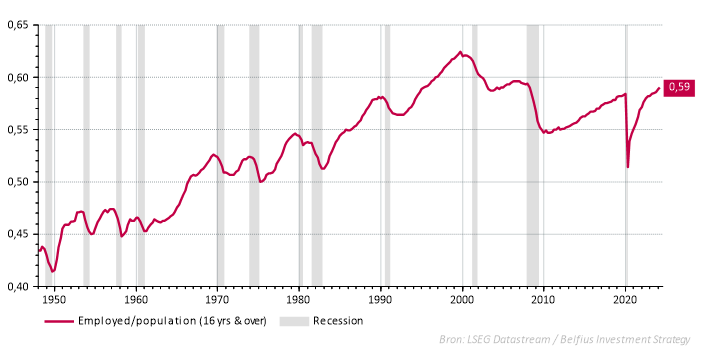 In vorige recessies, stijgt niet alleen eerst de werkloosheidsgraad, maar daalt de werkende bevolking ten opzichte van de totale bevolking. Dit percentage is vandaag nog steeds aan het stijgen. Dit geeft aan dat de werkloosheid veroorzaakt wordt door nieuwe arbeidskrachten die de arbeidsmarkt betreden, en niet door ontslagen.