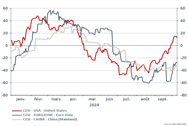 De bijgevoegde grafiek toont de historiek van de CESI-indicator van het afgelopen jaar. In de VS is de barometer al een aantal maanden positief, dus betere cijfers dan verwacht.