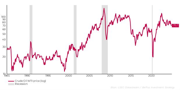 Dankzij de lagere olieprijs is ook het risico op een recessie aanzienlijk gedaald. Historisch gezien wordt zo goed als elke recessie voorafgegaan door een forse stijging van de olieprijs (met uitzondering van 2020, toen COVID een economische crisis veroorzaakte).