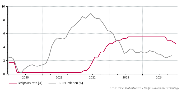 De hoge inflatie na de covid-pandemie dwong de Fed in 2022 om de rente sterk te verhogen. Het belangrijkste objectief van de Fed is namelijk het verzekeren van prijsstabiliteit binnen de economie. Instabiele of sterk stijgende prijzen zijn immers nefast voor de economie. Zo zorgen ze ervoor dat onze koopkracht daalt. Daarnaast leidt dit ook tot onvoorspelbaar gedrag onder consumenten, die plots moeten besparen op bepaalde producten, wat bedrijfswinsten kan impacteren.