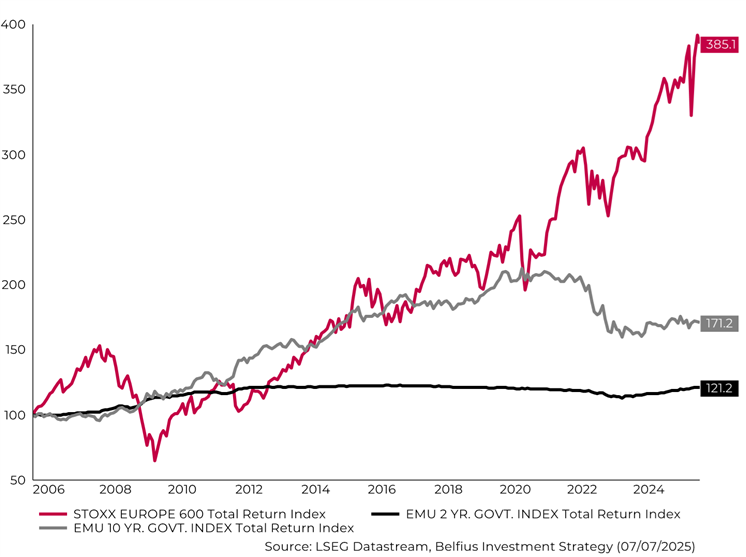 Onderstaande grafiek toont het verschil in langetermijnrendementen tussen Europese kortetermijnobligaties (zwarte lijn), langetermijnobligaties (grijze lijn) en aandelen (rode lijn).