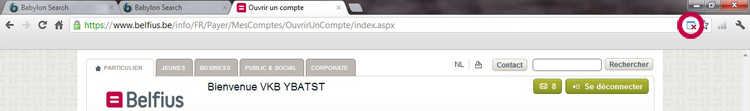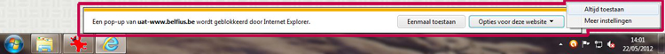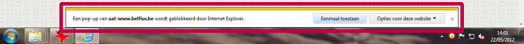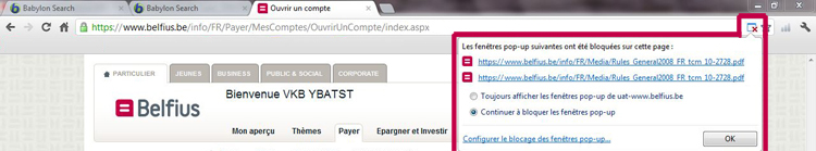 U kiest daarvoor rechts bovenaan in de browser op "Options" of "Preferences" en kiest vervolgens voor "Allow Pop-Ups for www.belfius.be" (of de equivalente term in het Nederlands). U kiest daarvoor "Always allow Pop-Ups from www.belfius.be" (of de equivalente term in het Nederlands) via het icoontje rechts bovenaan in de browser.